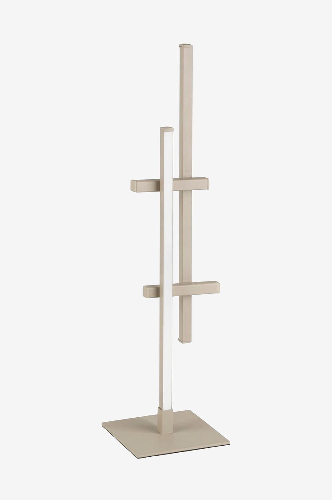 Led-bordslampan trepiliano kombinerar rena linjer med en skulptural design, vilket gör den till en fokuspunkt i alla moderna inredningar. Lampan består av två vertikalt placerade ljuskäglor i olika höjder som är förbundna med horisontella element som liknar ett grafiskt rutnät. Den sand-färgade finishen ger lampan ett varmt, elegant utseende som harmoniskt smälter in i naturliga och minimalistiska boendekoncept. Den integrerade led-tekniken ger ett jämnt och energieffektivt ljus med en behaglig ljusstyrka – perfekt som accentbelysning eller som dekorativ tilläggslampa. Tack vare sina kompakta mått passar trepiliano lätt på sideboards, fönsterbrädor eller hyllor.