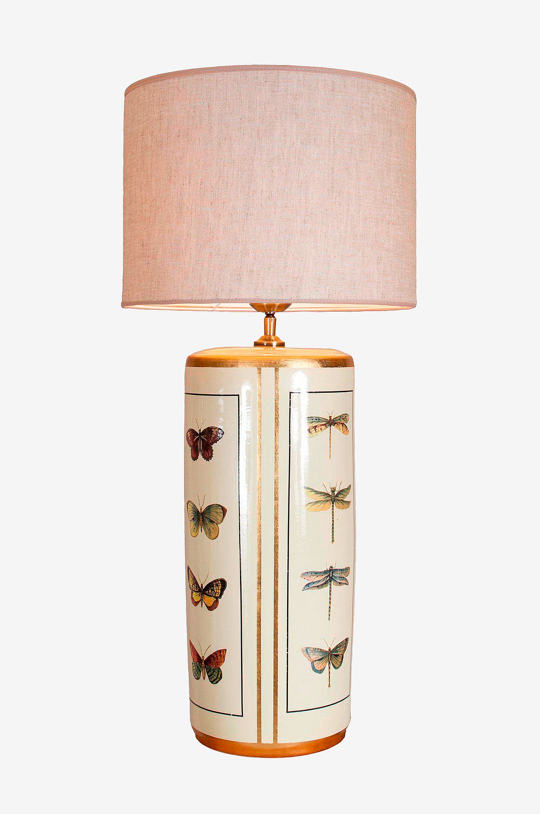 Denna bordslampa är ett verkligt konstverk – en djärv och färgstark keramikfot i en mjuk gul nyans, vackert utsmyckad med pastellfärgade fjärilar och skimrande gulddetaljer. Cylinderformen ger lampan en ren, arkitektonisk form som står i elegant kontrast till det lekfulla, dekorativa motivet. Resultatet är en lampa som känns både tidlös och oväntad – det perfekta valet för alla som vill ge sin inredning en personlig och livfull touch. Lampan har en imponerande höjd på 67 cm och en cylinderformad linneskärm med en diameter på 35 cm, vilket gör den till ett slående inslag oavsett om den placeras på ett sidobord, i en hall eller på en konsol. Den har ett e27-sockel (max 40w) och levereras med en 180 cm lång svart textilkabel med eu-kontakt. Strömbrytaren är placerad 40 cm från lampans sockel för enkel åtkomst. Ljuskälla ingår ej. Det här är mer än bara en lampa, det är en möbel som utstrålar värme, stil och karaktär.