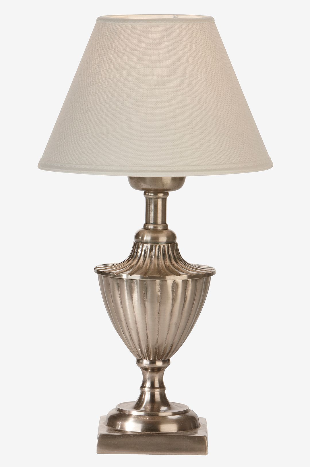 Lampfot i metall, antiksilver höjd 24 cm, bredd 8 cm. E27, max 40 w. 1,8 meter kabel med brytare. Skärm Royal, diameter 16/8 cm, höjd 10,5 cm. Vit laminerad linnetyg. Total höjd 30 cm.