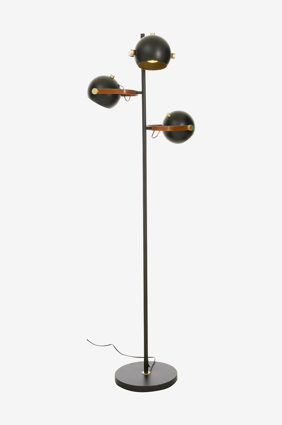 BOW golvlampa 3-arms. Lamphuvudet kan justeras till önskat läge. Strömbrytare på lamphuvudet. Material: metall och konstläder