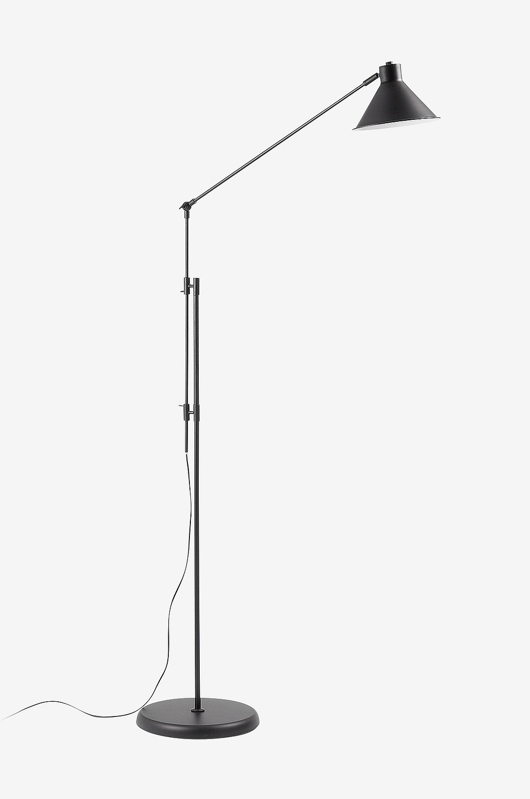 Ledad golvlampa med stomme och lampskärm av metall. Passar glödlampa E14 (medföljer ej). Höjd 220 cm Bredd 100 cm Djup 32 cm