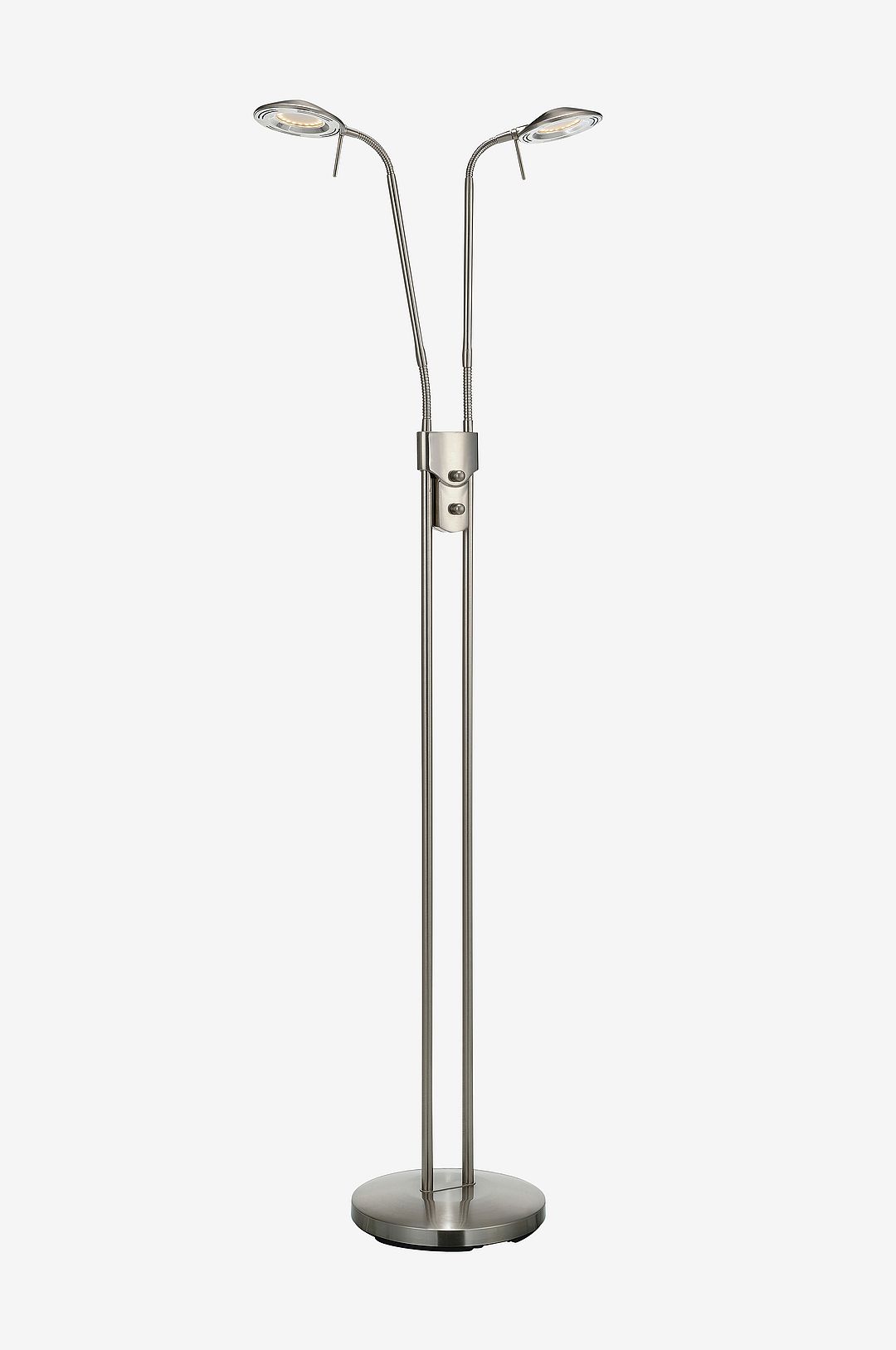 Markslöjd Hudson golvlampa i metall. Två justerbar skärmar med dubbla flexleder. Två inbyggda dimmer på pelaren. 2 st fast LED, 2x6W och 2×450 lumen. 120° spridningsvinkel. 3000K.
