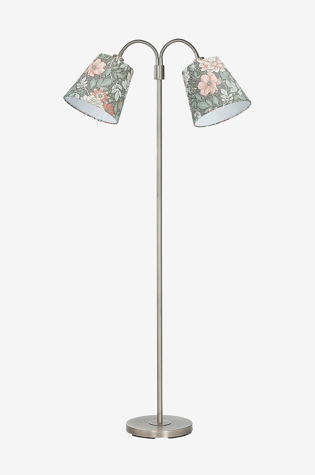 Amy golvlampa i metall inklusive cia top fit skärm. Skärmarna har ett mönster, i en lugn och rogivande färg, från boråstapeter. Lampskärmarnas mått: 20 cm diameter nedtill, 13 cm upptill och 19 cm höjd. E27 toppfattning. Lampan levereras i nedfällbart utförande och är lätt att montera. Golvlampans övre del har två justerbara armar med e27-lamphållare, max 25w, och strömbrytare vid en av armarna. 190 cm lång sladd med vägguttag. ljuskälla köps separat. Höjd 150 cm.