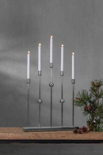 Stilren adventsljusstake i metall. Färgen är mässings. Ljusstaken har 5 ljuskällor med mysigt sken. Placera i ett fönster eller på en skänk, passar utmärkt till advent och jul.