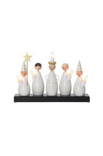 Träljusstake med Lucia, två tärnor och två stjärngossar. En av stjärngossarna håller i en målad guldstjärna i metall. Det finns ett litet hål på stjärngossen där sjärnan med pinne ska sättas i. Stjärnan är lös och måste sättas dit för hand. Lucia har en krans av guld av målade träkulor. 5 ljuskällor. Placera på en skänk eller i ett fönster för att sprida en härlig julstämning i hemmet. E10-sockel, ljuskälla ingår. Vit anslutningskabel, 180 cm. Höjd 22 cm, bredd/längd 33 cm och djup 9 cm.