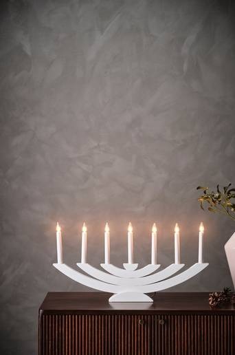 En elegant träljusstake i vit färg som skapar en härlig julstämning i ditt hem. Ljusskällor ingår. Textilsladd, sladdlängd 1,8 m. Material: Trä. Storlek: Höjd 30 cm, bredd 60 cm, djup 5,5 cm. Sockel/lampa: 7 st E10-sockel, max 3W.