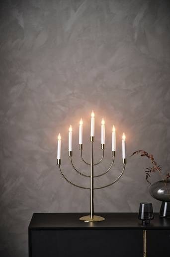 Elegant metalljusstake i mässingsfärg. Elljusstaken har 7 ljuskällor som sprider ett härligt ljus och skapar mysig julstämning i ditt hem. Vit sladd, sladdlängd 1,8 m. Material: Metall. Storlek: Höjd 59 cm, bredd 38 cm, djup 14 cm. Sockel/lampa: LED.