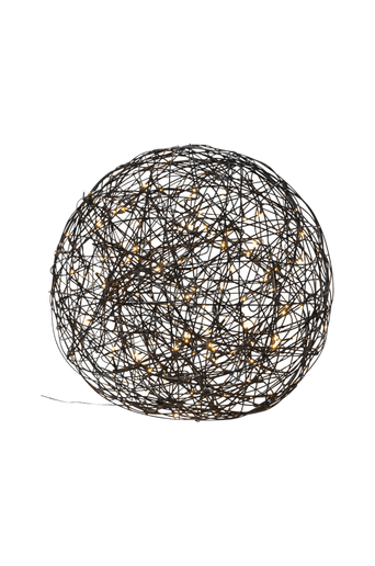 Dekorativ svart version av Trasselbollen för både inom- och utomhusbruk. I metall och aluminium. Inuti dekorationen finns en LED-ljusslinga med 150 LED som avger ett varmvitt sken. Höjd 50 cm, anslutningskabelns längd är 5 m. Designad av Charlotte Falck.