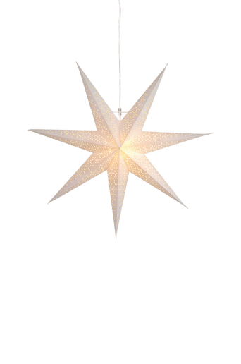 Hängande stjärna i papper. Höjd 70 cm. Djup 16 cm. Bredd 70 cm. Anslutningskabel 3,5 m. E14 sockel. Ljuskälla ingår ej.