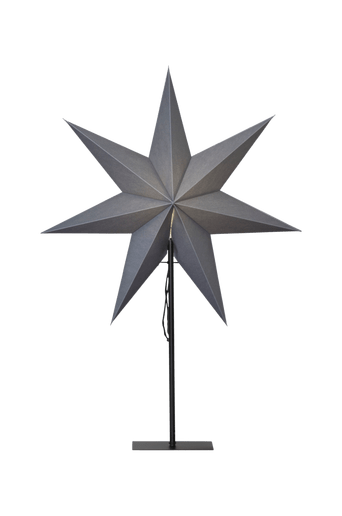 Stjärna på fot med svart textilkabel. Elegant stjärna att dekorera med i hemmet. Stjärnan har plats för en ljuskälla. Höjden är 75cm, bredd 55 cm, djup 15 cm. Sockel E14. Max 25 W. Sladdlängd 180 cm.