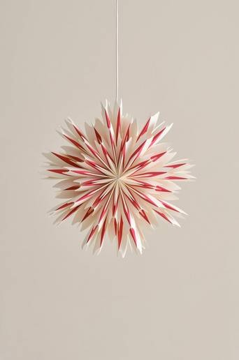 THEBE ger charm och festlig magi till vardagsrummet, köket eller sovrummet. Denna stjärnformade dekoration, som liknar en stor snöflinga, ger en varm känsla till ditt rum. THEBE är inte bara visuellt fantastisk utan också praktisk, eftersom den är lätt att fälla upp och ner för enkel förvaring. Förvandla ditt hem med den förtrollande julstjärnan THEBE. Lamphållare med plastsladd ingår. Produkten är certifierad med Forest Stewardship Council (FSC), vilket innebär att den innehåller trä som avverkats i ett ansvarsfullt skogsbruk som tar hänsyn till människor och miljö. Licensnummer & testinstitut: Inmark Exports FSC-C185719 TÜV SÜD Material: papper. Storlek: ø 50 cm, djup 20,5 cm. Sockel: E14. Effekt max: 25 w. Ljuskälla ingår ej. Monteringsanvisning medföljer.