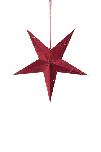 Sammets stjärna med dew drops slinga BO med 40 LED för innomhus bruk, kan användas både hängande och stående mot en vägg. En mysig inredningsdetalj till hemmet. Höjd 60 cm. Drivs med 3 AA batterier (ingår ej). Timer 6 h på, 18 h av, repeterande.