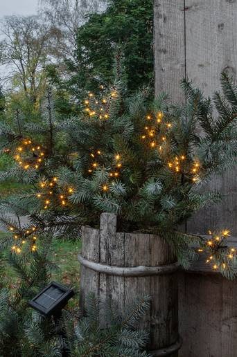 Solcellsdriven Firework slinga med 8 kluster där 12 varmvita daggdroppljus lyser. Ljusslingans längd är 210 cm. Höjd 7 cm och djup 7 cm. Avstånd mellan lamporna är 30 cm. Led ljuskälla ingår samt batteri ingår till ljusrelät. Medellivslängd ca 10000 timmar. Anslutningskabelns längd 200 cm (PVC). Total effekt 1W. Volt 1,2 V DC..