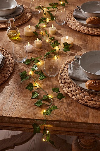 IVY ljusslinga tillför charm till ditt vardagsrum med sina fina konstgjorda murgröneblad och 20 varmvita lampor. Den är perfekt för dukning och skapar en inbjudande atmosfär och förhöjer alla utrymmen med sitt subtila sken och naturliga elegans. Material lampfot: ABS-Plast. Material lampskärm: polyester. Totallängd:200 cm. Avstånd mellan lampor: 10 cm. Längd på anslutningssladd:30.0cm. Sockel/ljuskälla: 20st LED. Max watt: 0.1. Drivs av 2 st AA-batterier. Batterier ingår ej. Timer: 6timmar på, 18 timmar av. Repeterande. Endast användning inomhus. Ej för utomhusbruk.