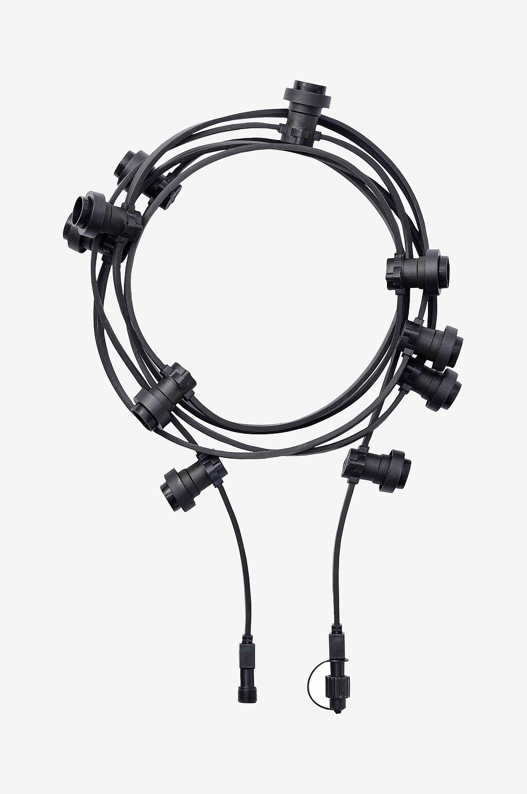Bright ljusslinga som add-on till start ljusslingan. Denna är med en hanekontakt i den ena ändan och honakonakt i den andra. Total längd är 4,9m. Från hanekontakt till första lamphållare är 20cm, därefter är det 0,5 meter emellan dem. Efter sista lamphållare är det 20cm kabel framtill honakontakten. Ljusslingan säljs utan ljuskällor. Belastning på varje lamphållare är max 15w. Du kan köpa till de ljuskällorna du vill och ändra utseendet på ljusslingan med enkla medel. I vårt sortiment hittar du många olika led ljuskällor som passar i denna ljusslinga. Ce och ipp44 märkta.