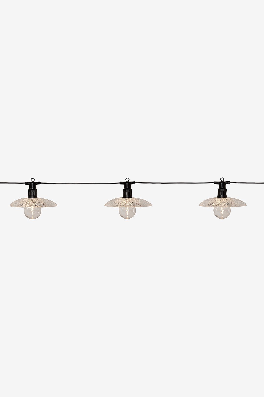 Exklusiv partyslinga med 6 lampor. Varje lampa med en transparent skärm som liknar pressglas. Förgyll uteplatsen eller trädgården med denna slinga. Ger ett härligt sken. Svart kabel med 70cm mellan lamporna.