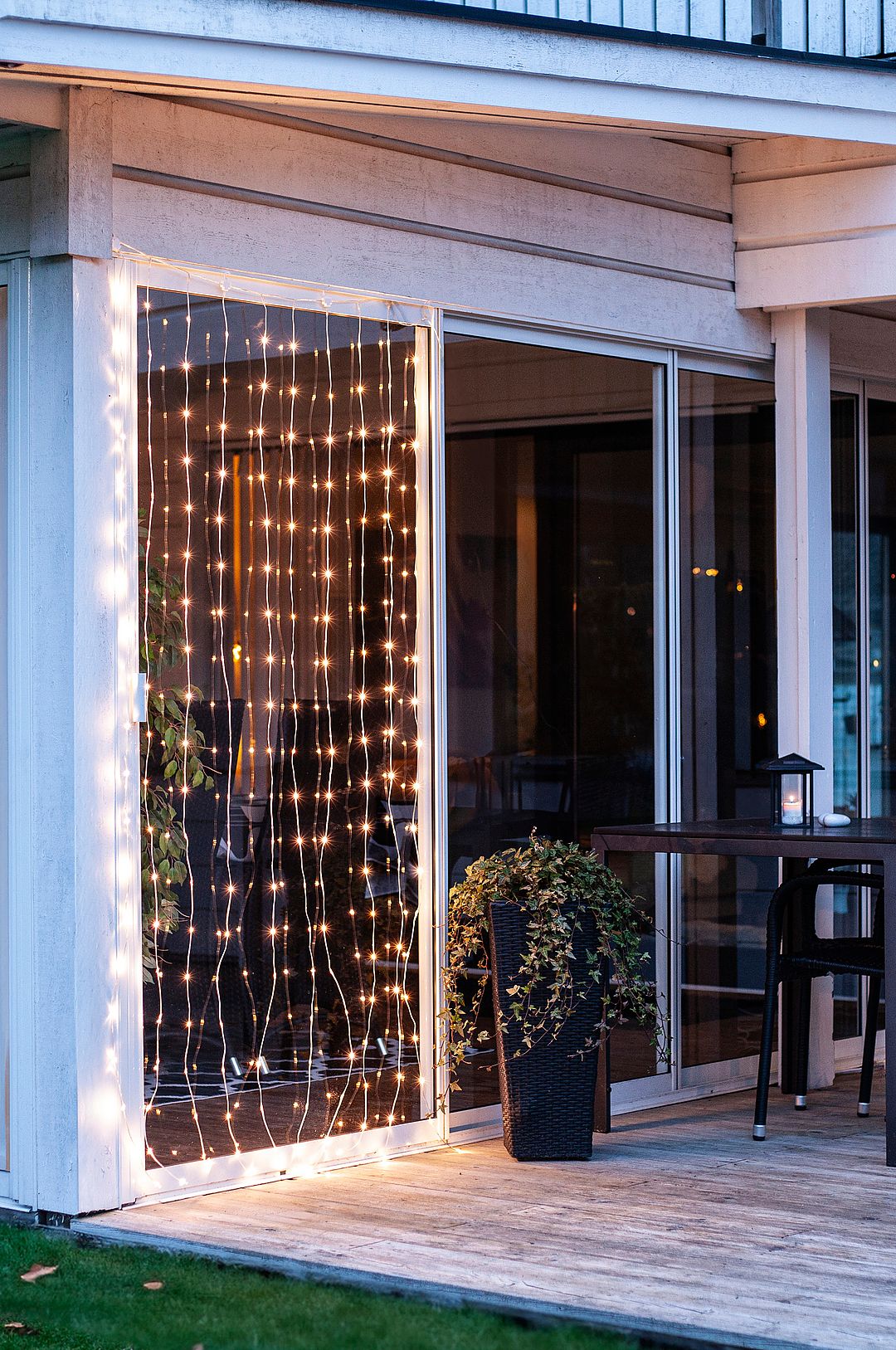 Ljusridå för utomhusbruk med tunna diskreta transparenta kablar, storlek 1x2m. 10 strängar med 20 små varmvita led-ljuspunkter på varje sträng. Lys upp uteplatsen, partytältet eller t.ex. väggen för ett stämningsfullt ljus. Ip44-klassad transformator.