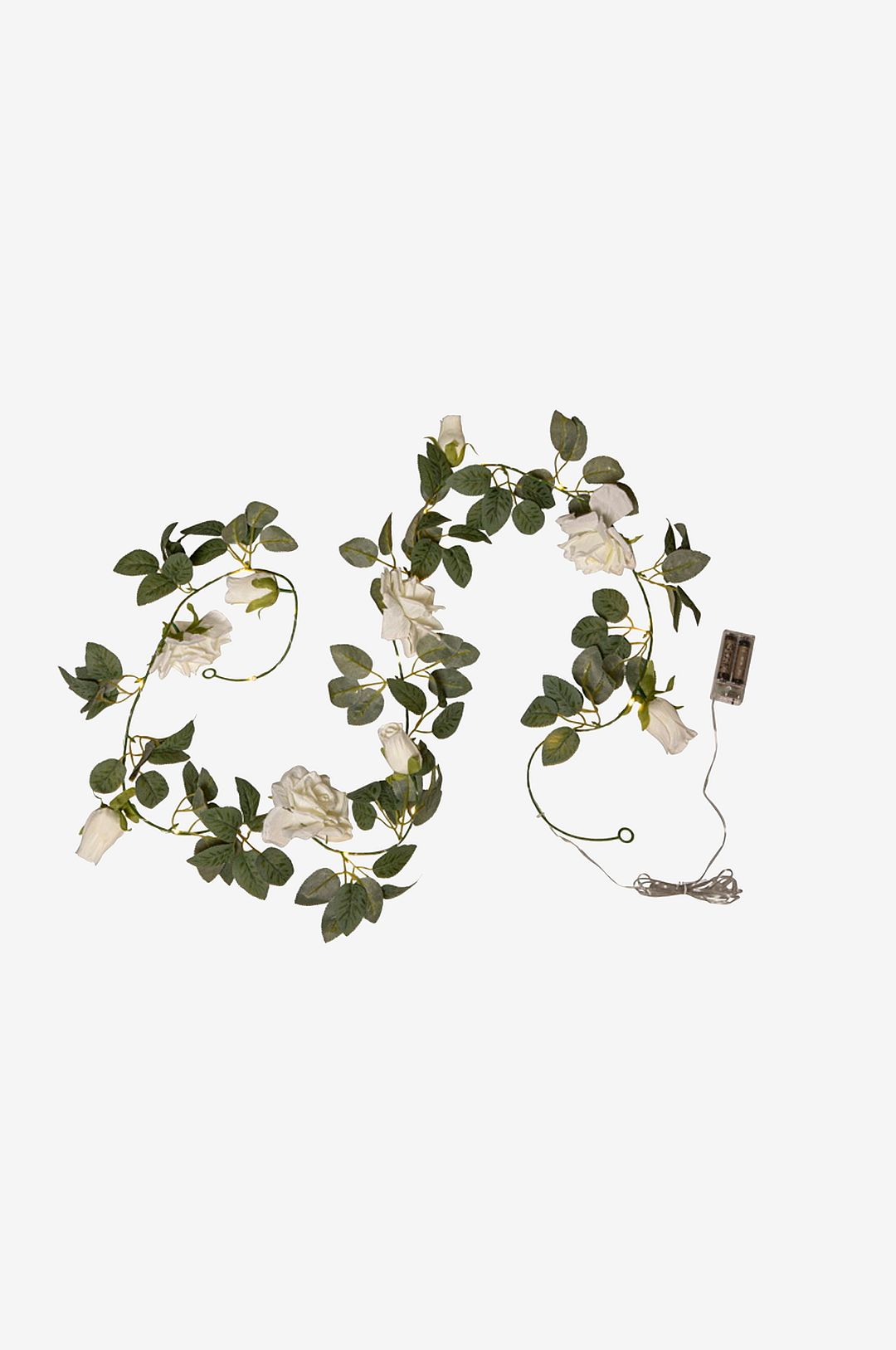 Dekorativ ljusslinga med konstgjorda rosor och blad i vit och grön färg för inomhusbruk. Tunn metallsträng med 20 varmvita led-lampor lindade runt blommorna. En vacker dekoration för hemmet, t.ex. för bordsdekoration, batteridriven med timerfunktion.