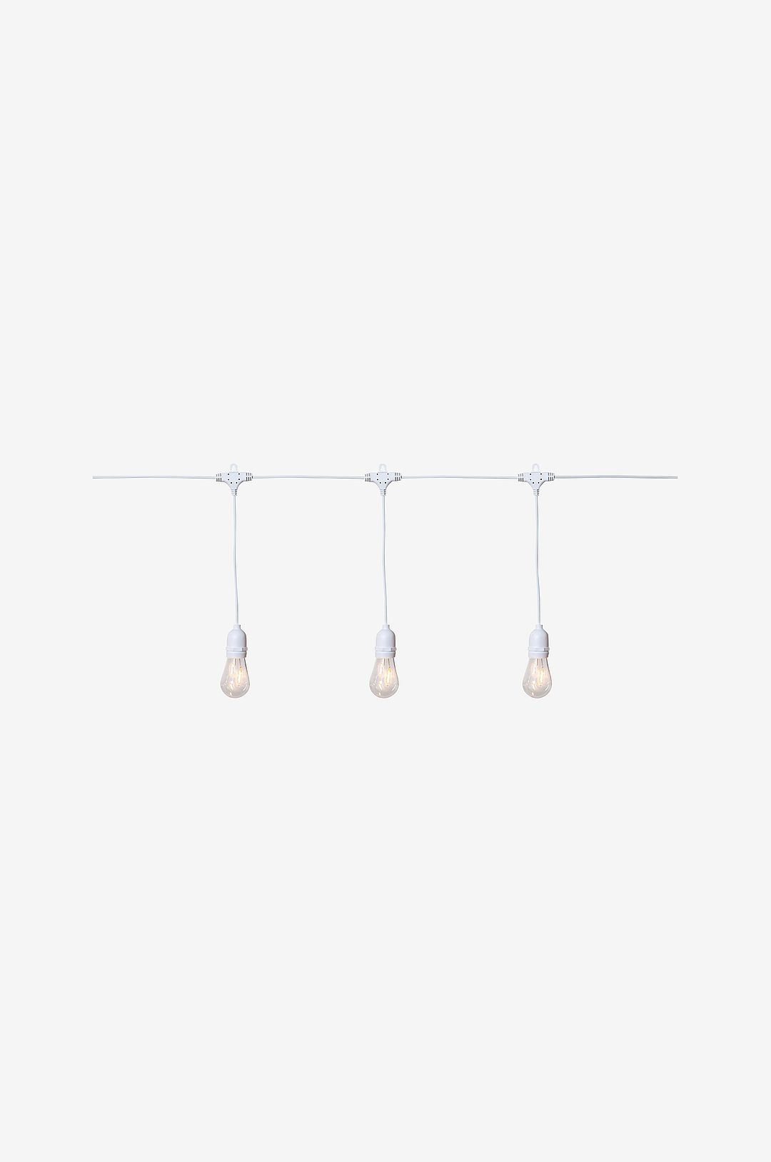 Partyljusslinga med 10 st klara höljen med filament LED inuti. Härlig ljusslinga att inreda med till vardags och fest. Ger ett vackert sken i mörkret. Transformator: 24V DC 1.8W, IP44, Schuko-kontakt. Anslutningskabelns längd är 500 cm. Avstånd mellan lamporna, 40 cm.