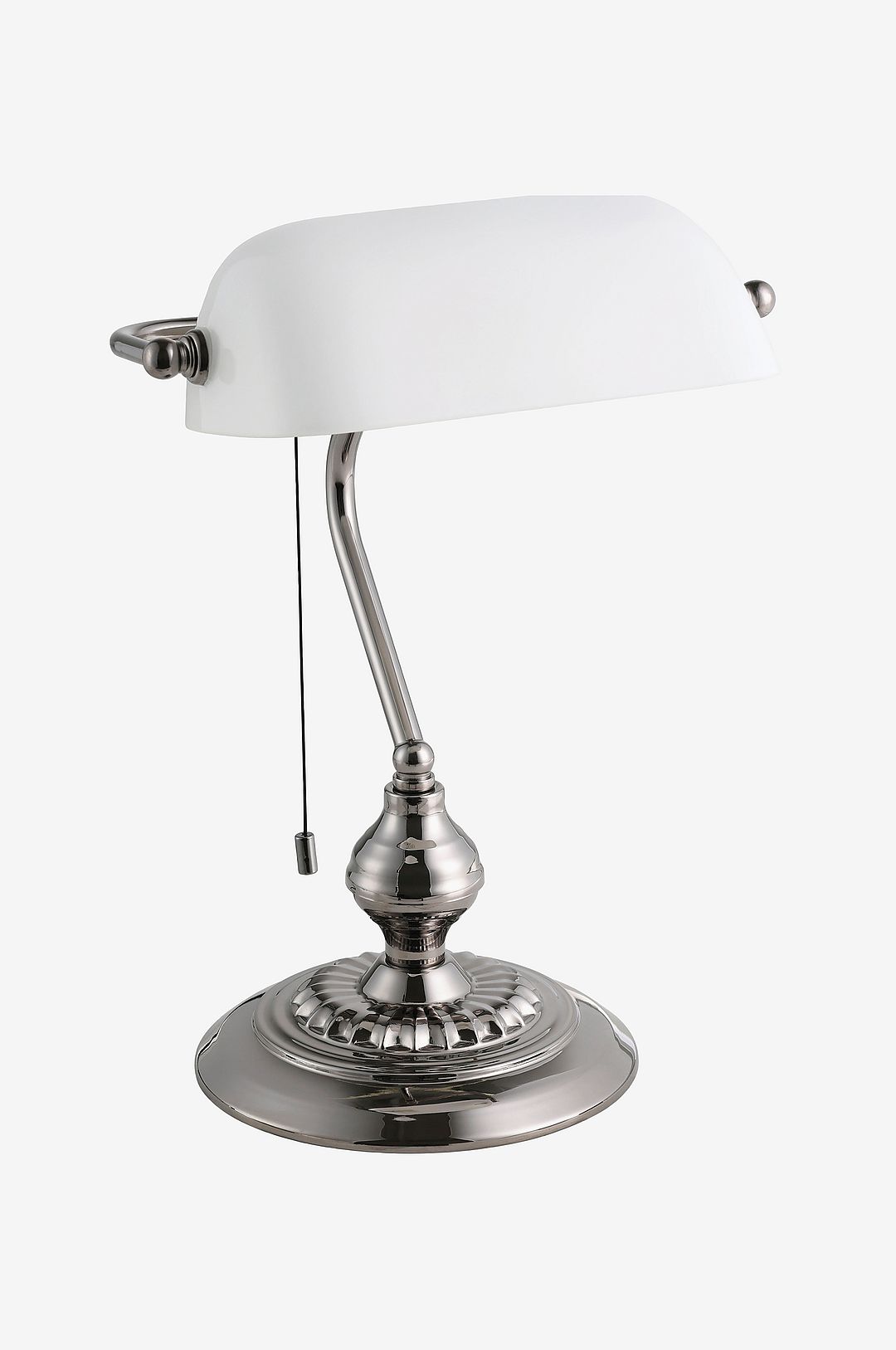 Bordslampan banker har en dekorativ mässingsfärgad metallfot och en svängbar lampskärm av målat glas med vit insida. Med sin typiska art deco-design kommer bordslampan att bli ett blickfång i alla vardagsrum. banker -lampan kan enkelt tändas och släckas med hjälp av en dragströmbrytare på huvudet. Den ger en stilfull belysning i sovrummet, vardagsrummet eller hallen, men fungerar särskilt bra som skrivbordslampa på kontoret. Glödlampan ingår inte. Produkten har en e27-lamphållare och kräver en e27-glödlampa.