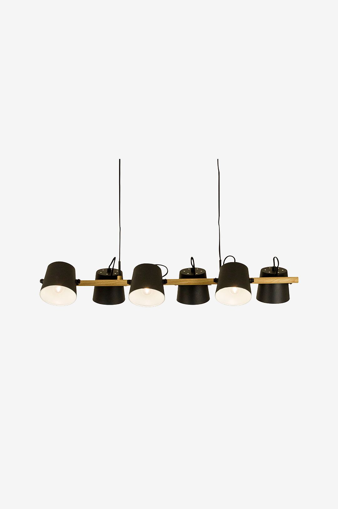 ESPRESSO taklampa av metall med svarta skärmar på metallstång i träimitation. Skärmarna och lampans höjd kan justeras till önskat läge.