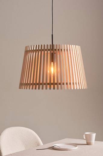 Taklampa i med smala ribbor av gummiträ. Ljuset silas fint mellan ribborna. Lampans höjd kan justeras med sladdlängden. Takkopp av metall med krokupphänge. Svart plastsladd. Lampan är jordad, klass 1. På grund av EU-regler behövs en separat takkontakt i vissa länder. Takkontakten ska vara jordad (klass 1) och köps separat. Material: Gummiträ, metall och plast. Storlek: Höjd 30 cm, ø nedtill 50 cm, ø upptill 40 cm. Tips/råd: Kombinera med Filament dekorationslampa LED dimbar glob E27 4W ø 95 mm 1622941-01, 1622941-01 eller Filament dekorationslampa LED dimbar glob E27 4W ø 95 mm 1622940-01.
