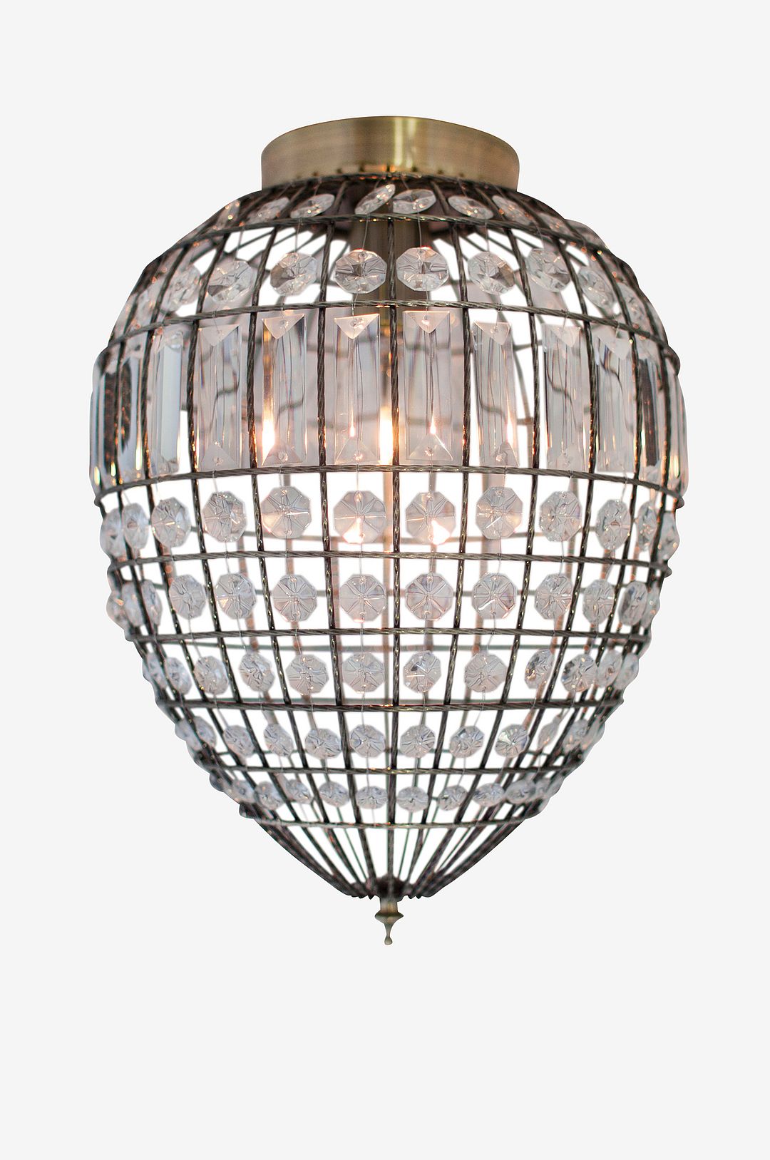 Plafond Amadeus i antikfärgad metall och med prismor i klarglas. H: 39 cm, Ø: 30 cm. E27 stor sockel max 60W (ingår ej). Krokupphängning.Takkontakt ingår ej på grund av nytt EU direktiv. De finns att beställa separat.