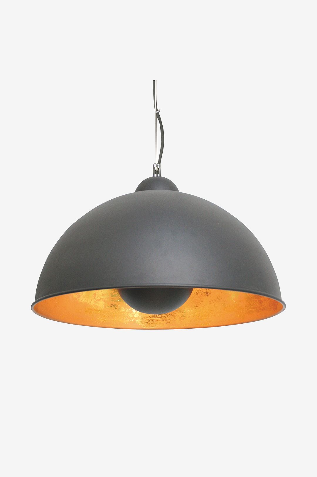 Metall, matt svart med guldfärgad insida och bländskydd. Svart textilkabel och vajer. Ø 53 cm. E27 lamphållare. Ljuskälla ingår ej.Takkontakt ingår ej på grund av nytt EU direktiv. De finns att beställa separat.