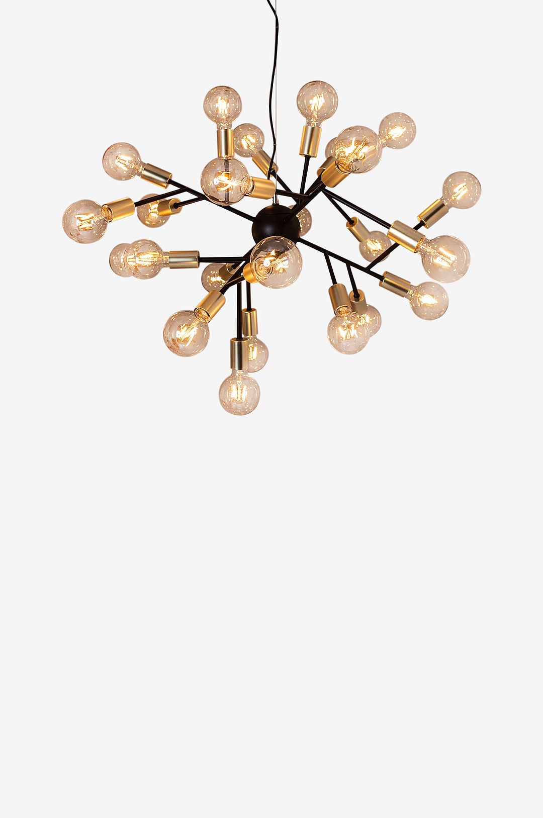 Taklampa Heroes med 24 st matta mässingslamphållare E27. 120 cm svart textilkabel, takkopp i svart metall. Ø80 cm, höjd 50 cm. Ljuskällor ingår ej. Rekommenderar Ø95 mm globlampor 18W alt LED 4 W.Takkontakt ingår ej på grund av nytt EU direktiv. De finns att beställa separat.
