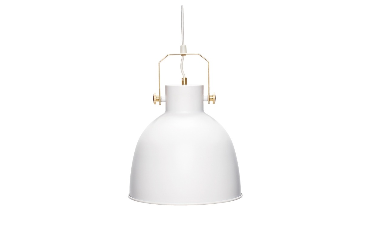 Tuff industriell taklampa i vit färg med detaljer av guld. En vacker lampa som ger miljön kring bordet ljus och värme.Design & egenskaperIndustriell taklampa med tufft uttryck.Tillverkad i metall.Sladd i svart.E27, max 40W. Ljuskälla och lamppropp med sladd ingår ej.