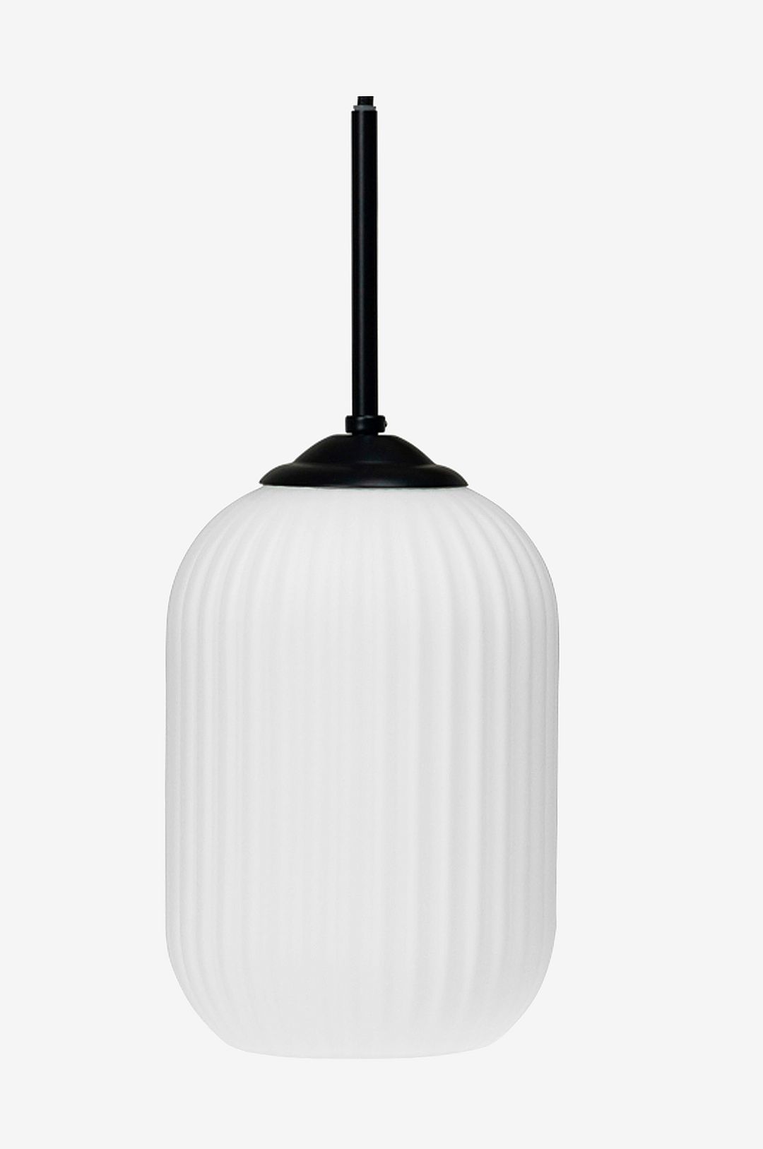 Riflet pendel opalglas med svart upphäng d14. Levereras med en 2 meter lång tygsladd. Sockel 40w/ e27.
