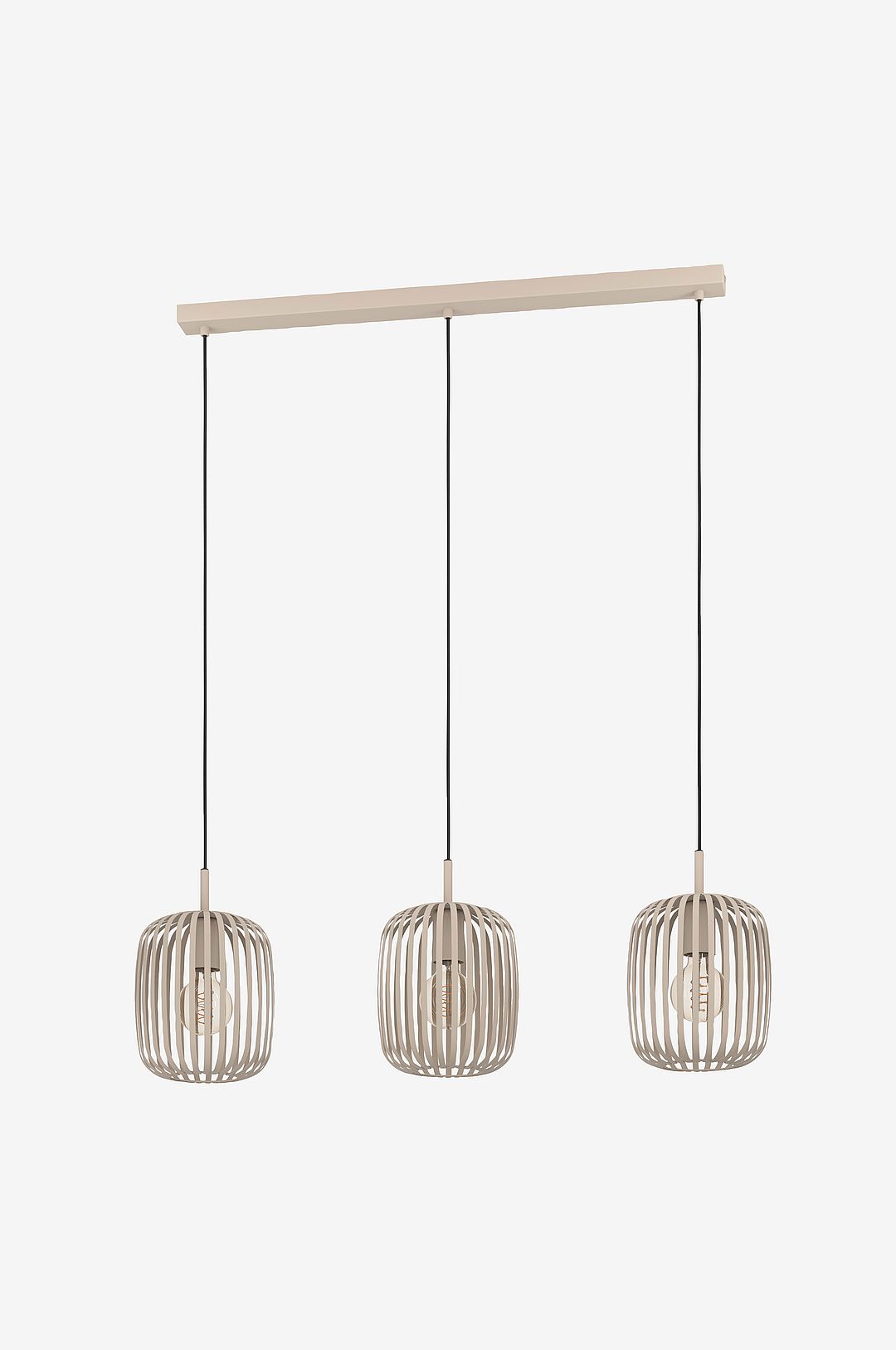 Pendellampan romazzina är perfekt för att tillföra modern stil till ditt hem. Den här slående pendellampan har tre stora lampskärmar med burar i svart eller beige finish, var och en upphängd i en textilkabel från en långsträckt baldakin. Pendellampan har en halvsynlig glödlampsdesign som ger en dramatisk ljuseffekt när den tänds. Pendeln har en modern stil och skapar djärv belysning för ett modernt eller minimalistiskt hem, oavsett om det är i vardagsrummet eller ovanför matsalsbordet. Produkten har e27-lamphållare och kräver 3 x e27-glödlampor, som inte ingår.