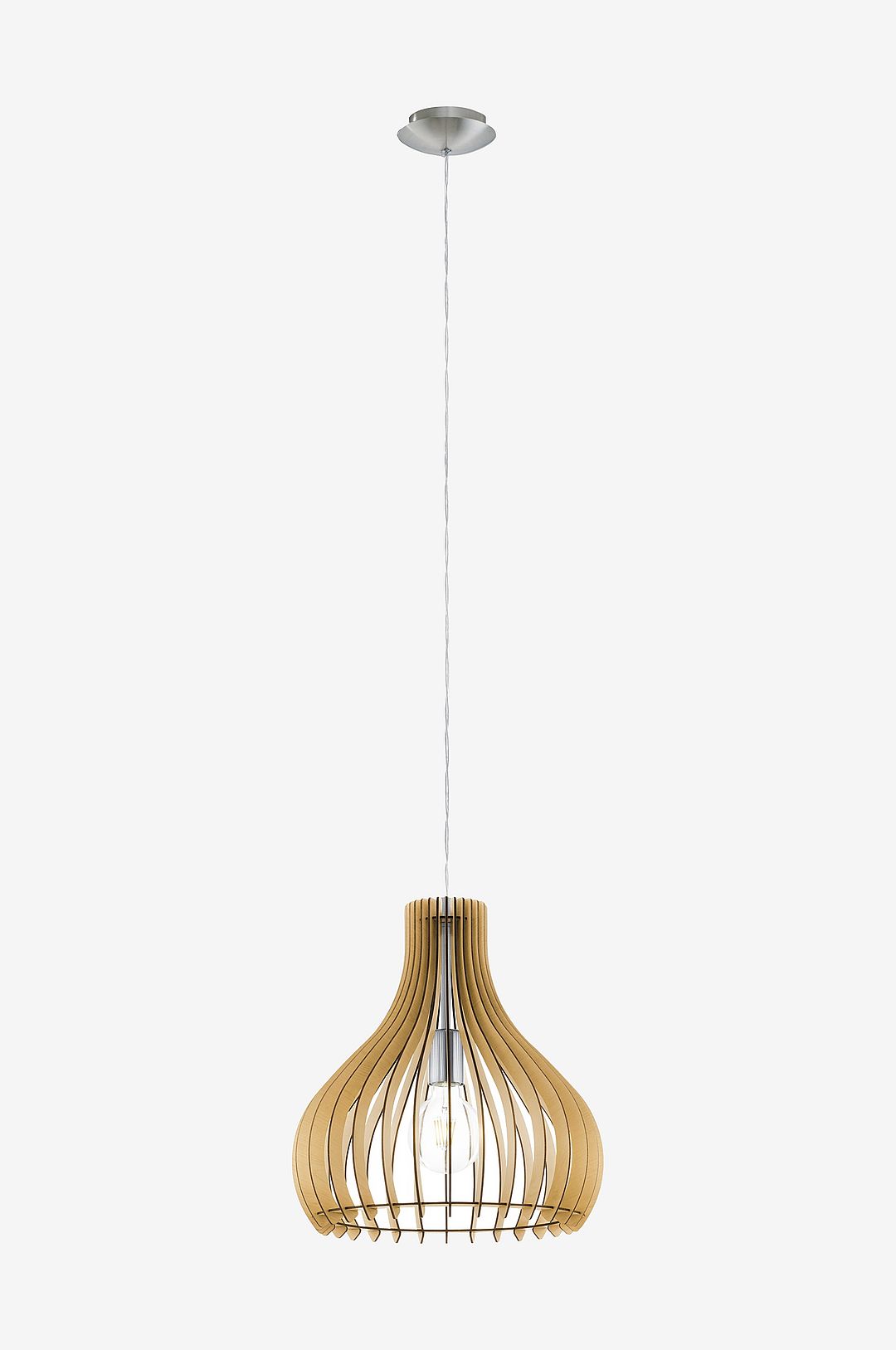Pendellampan tindori har en rundad lampskärm av naturliga lönn- eller vita träsegment med ett tak av matt nickelmetall. Den inre sfären i vitt glas kompletterar lampans moderna utseende och ger en attraktiv belysning. Med en diameter på 38 cm smälter pendellampan sömlöst in i moderna inredningsstilar och ger en välkomnande belysning i vardagsrummet eller ovanför bordet i matsalen. Glödlampan ingår inte. Produkten har en e27-lamphållare och kräver en e27-glödlampa.