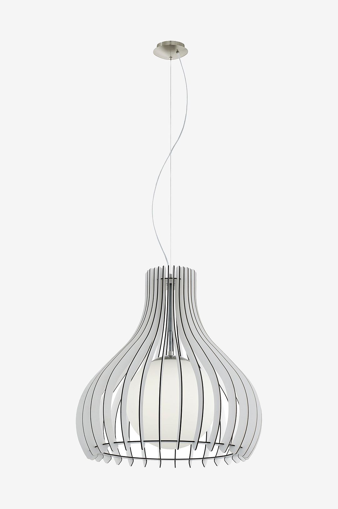 Pendellampan tindori har en rundad lampskärm av naturliga lönn- eller vita träsegment med ett tak av matt nickelmetall. Den inre sfären i vitt glas kompletterar lampans moderna utseende och ger en attraktiv belysning. Med en diameter på 50 cm smälter pendellampan sömlöst in i moderna inredningsstilar och ger en välkomnande belysning i vardagsrummet eller ovanför bordet i matsalen. Glödlampan ingår inte. Produkten har en e27-lamphållare och kräver en e27-glödlampa.