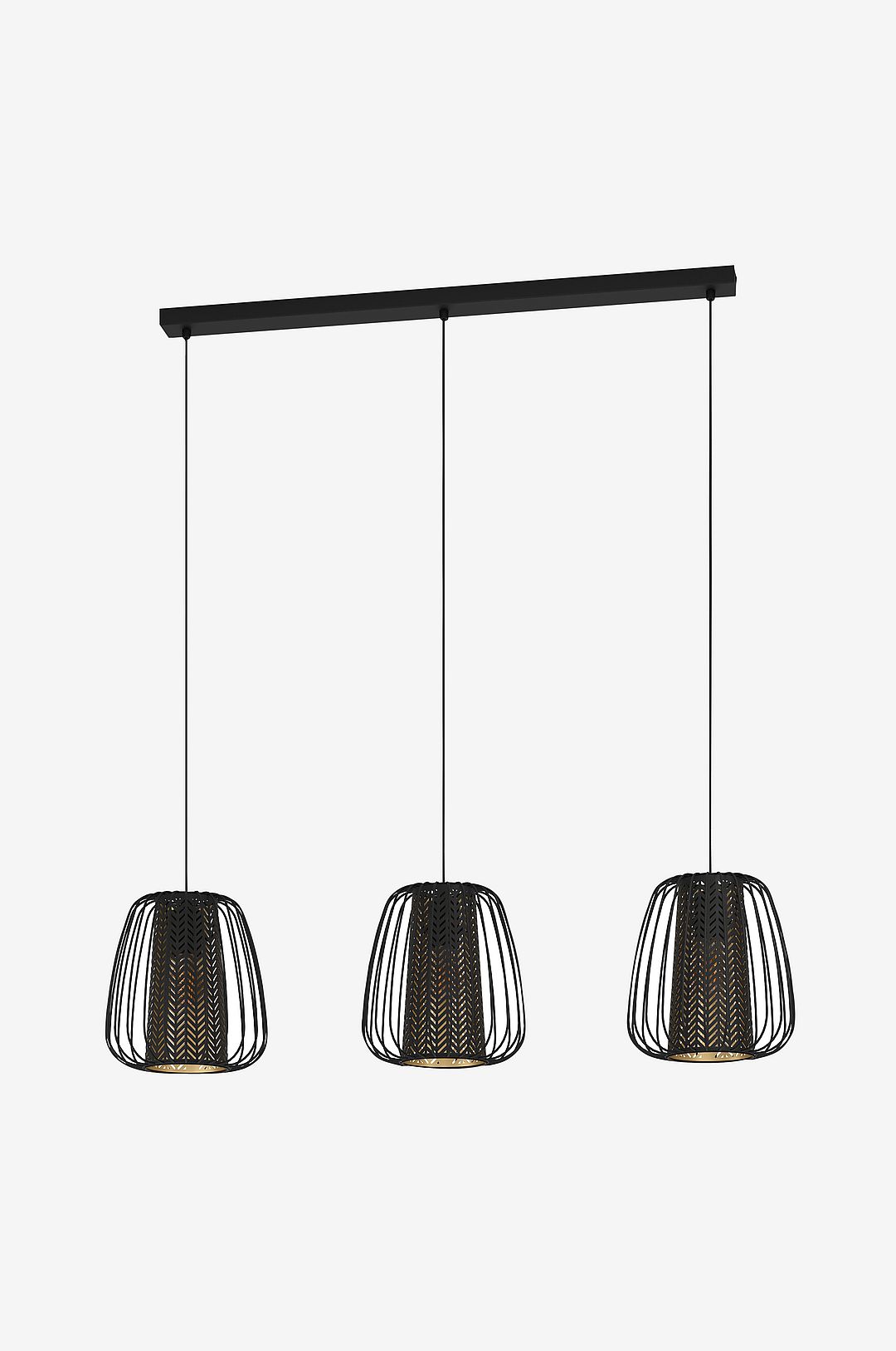 Pendellampan curasao har tre rundade lampskärmar i svart tråd som var och en omger en inre cylinder i tyg. De svarta tygskärmarna har gulddetaljer och fina utskärningar som skapar en dramatisk ljuseffekt och ett fascinerande spel av ljus och skugga. Med sin övertygande kombination av metall och tyg kompletterar pendellampan moderna interiörer på ett utmärkt sätt och skapar rätt stämning i alla utrymmen. Produkten kräver 3 x e27-glödlampor som inte ingår.