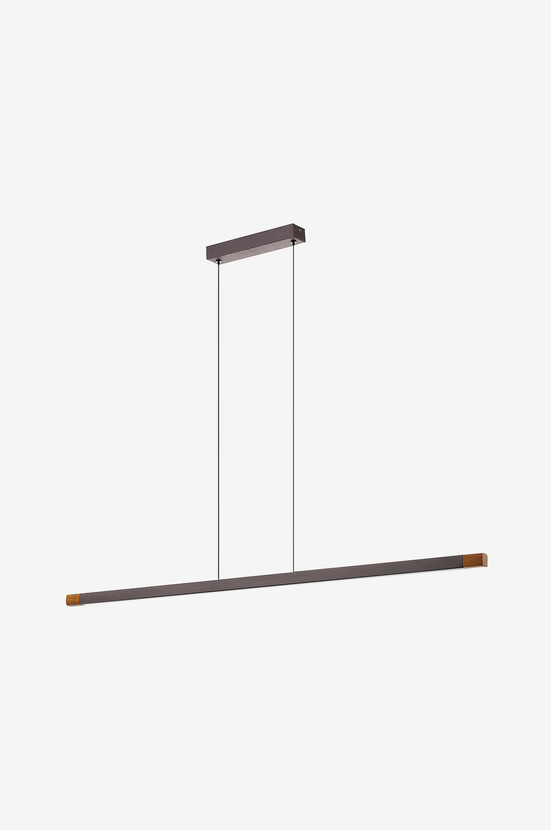 Pendellampan lisciana har en upphängd aluminiumprofil i mörkbrun färg med detaljer av gummiträ i valnötsfinish. Lampans moderna utseende kompletteras av de svarta textilkablarna och metalltaket. De integrerade lysdioderna bakom den mattvita ljuspanelen i plast kan dimmas med hjälp av en koordinerande vriddimmer på väggen och ger ett behagligt varmvitt ljus. Med sin linjära design och längd på 126 cm ger pendellampan en perfekt belysning ovanför matsalsbordet.