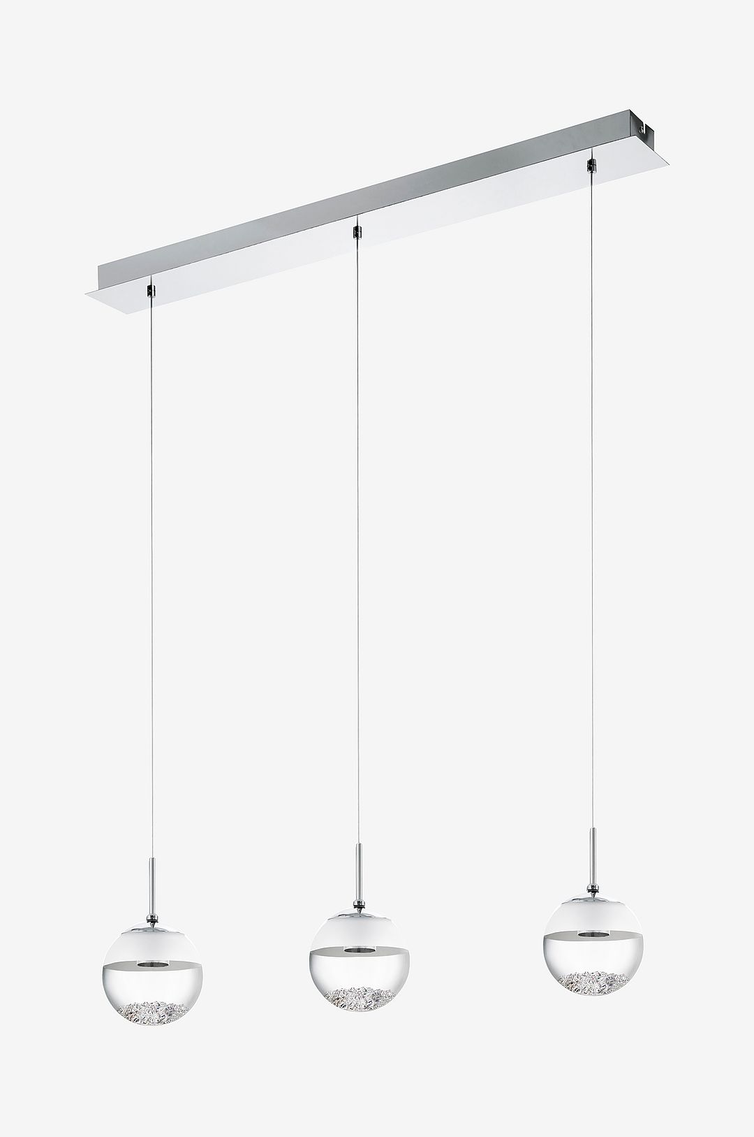 montefio 1 led pendellampa har tre sfäriska lamphuvuden i klart och satinerat glas. Designen har ett långt takfäste i kromfärgat stål och varje lampskärmssfär innehåller inre kristaller. De högkvalitativa glaskristallerna skapar ett gnistrande, avancerat utseende när lampan är tänd, medan de integrerade lysdioderna ger ett behagligt varmvitt ljus. Denna taklampa är den perfekta pricken över i:et för moderna interiörer och skapar en distinkt belysning i vardagsrummet eller ovanför matsalsbordet.