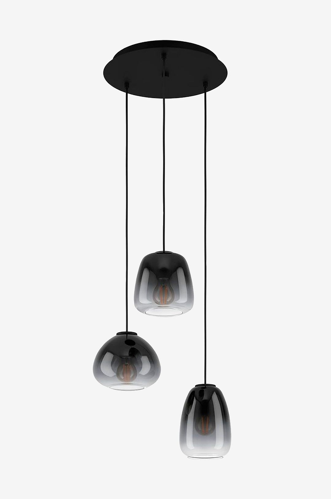 Pendellampan aguilares har tre mjukt böjda, upphängda glaslampskärmar, var och en med olika design och färggradient, som tonar från svart till transparent. Lampskärmarna är upphängda i olika höjder på svarta textilkablar från en oval baldakin av svart metall, vilket vackert kompletterar lampans eleganta utseende. Pendellampan smälter sömlöst in i moderna stilar och skapar en distinkt belysning i vardagsrummet eller ovanför bordet i matsalen. De avbildade glödlamporna ingår inte. Produkten har e27-lamphållare och kräver 3 x e27-glödlampor.
