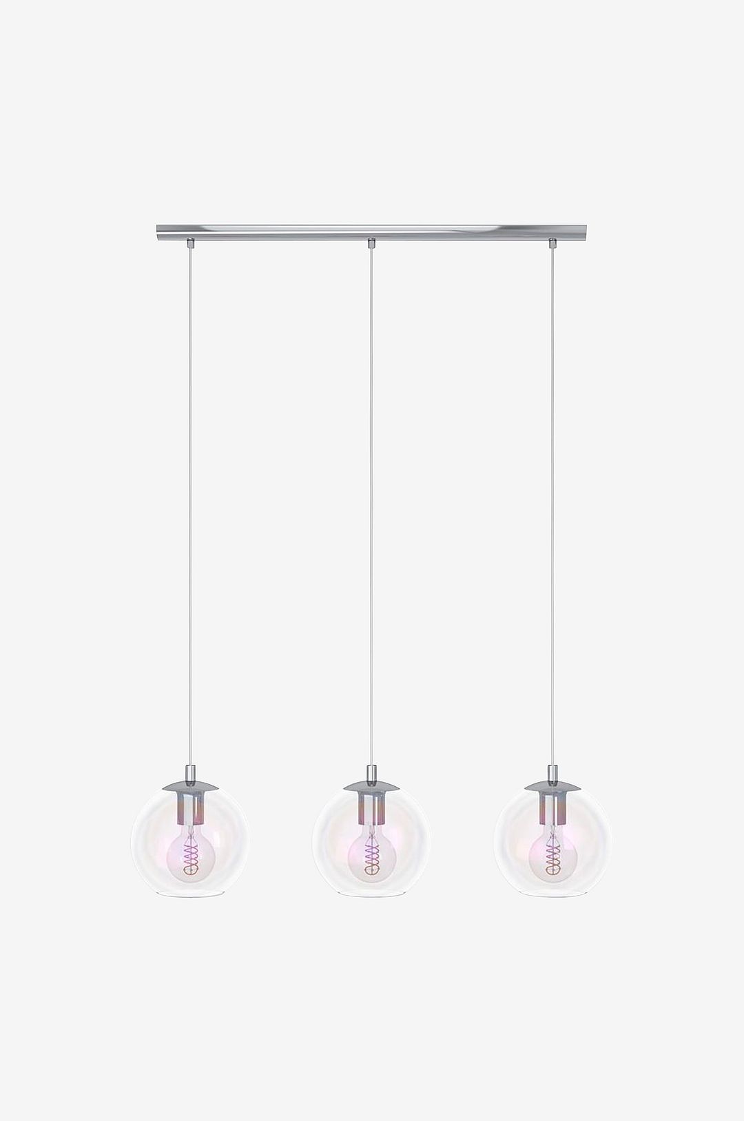 Pendellampan ariscani 2 imponerar med sitt eleganta utseende och sin moderna design. Tre sfäriska glasskärmar med ett iriserande utseende hänger från känsliga kabelupphängningar på en långsträckt baldakin i blank krom. Det iriserande glaset leker med ljuset och skapar fascinerande färgreflektioner beroende på betraktningsvinkeln. Lampan är särskilt effektfull ovanför ett matbord, i en bar eller i vardagsrummet. På grund av den öppna designen rekommenderas att lampan kombineras med dekorativa e27 glödlampor – dessa ingår inte. Lampan tillför modern design och stilren elegans till ditt hem.