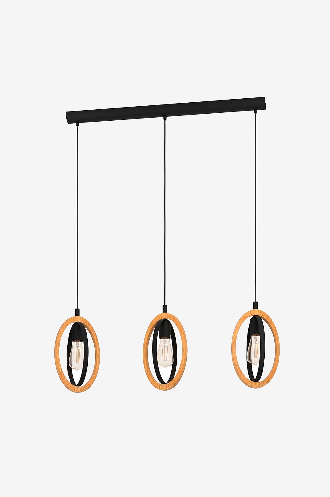 Pendellampan basildon har tre upphängda lampor som var och en består av två ovala element tillverkade av ljus wood och black metall. De ovala elementen, som hänger från taket på en black metallskärm, är placerade inuti varandra och skapar ett fascinerande ljus- och skuggspel så snart lampan tänds. Med sin övertygande blandning av trä- och metallmaterial och den synliga glödlampan ger denna taklampa i loftstil modern belysning för alla utrymmen, oavsett om det är i vardagsrummet eller över ett långbord i matsalen. Produkten kräver 3 x e27-glödlampor som inte ingår.