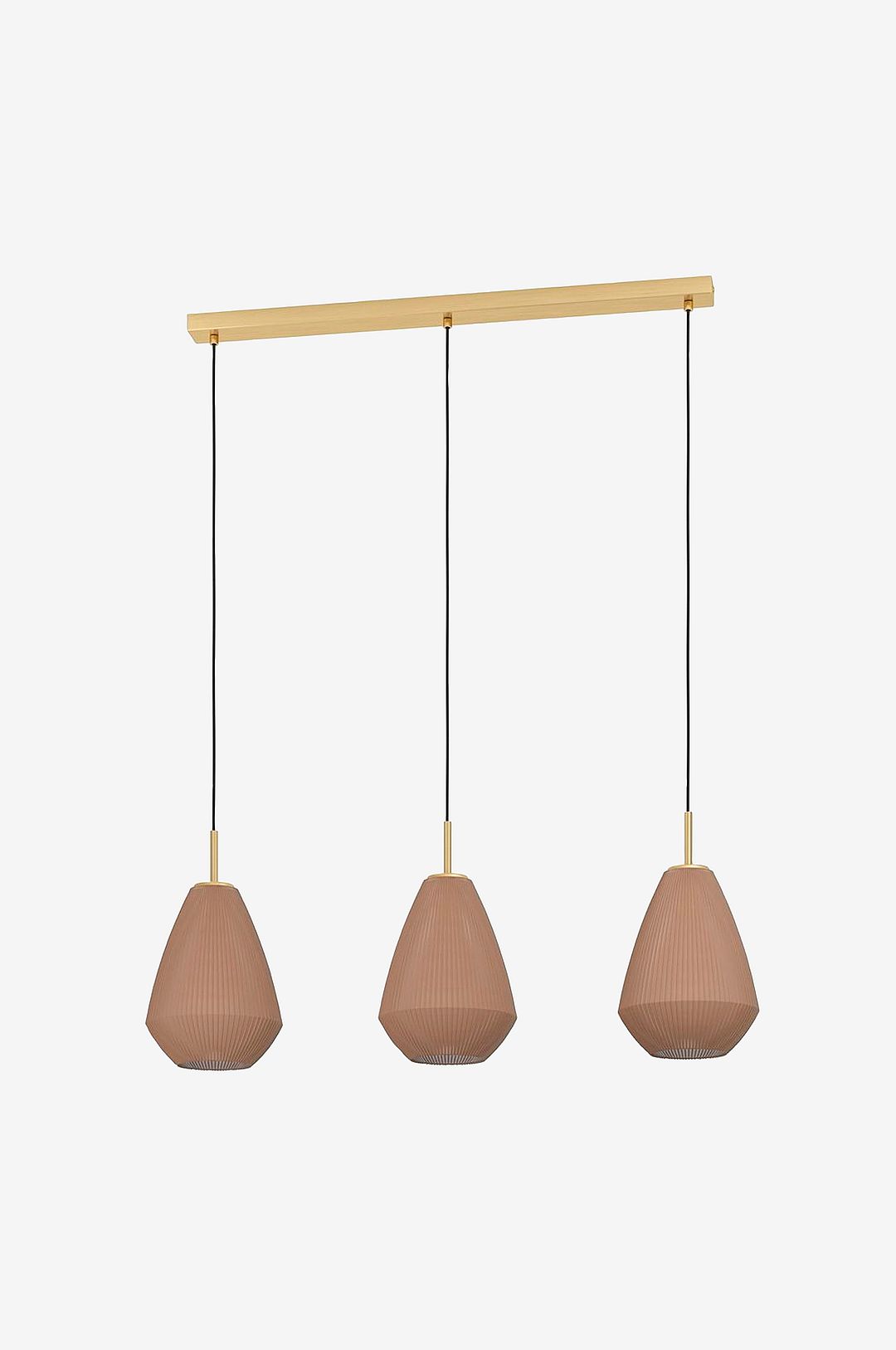 Pendellampan caprarola har tre koniska, satinfärgade glaslampskärmar i sandfärgad finish som hänger från en långsträckt, mässingsfärgad metallbaldakin. Pendellampan kompletterar moderna inredningar och ger en mysig stämningsbelysning i alla rum, oavsett om det är i vardagsrummet eller ovanför matbordet. Produkten har e27-lamphållare och kräver 3 x e27-glödlampor, som inte ingår.