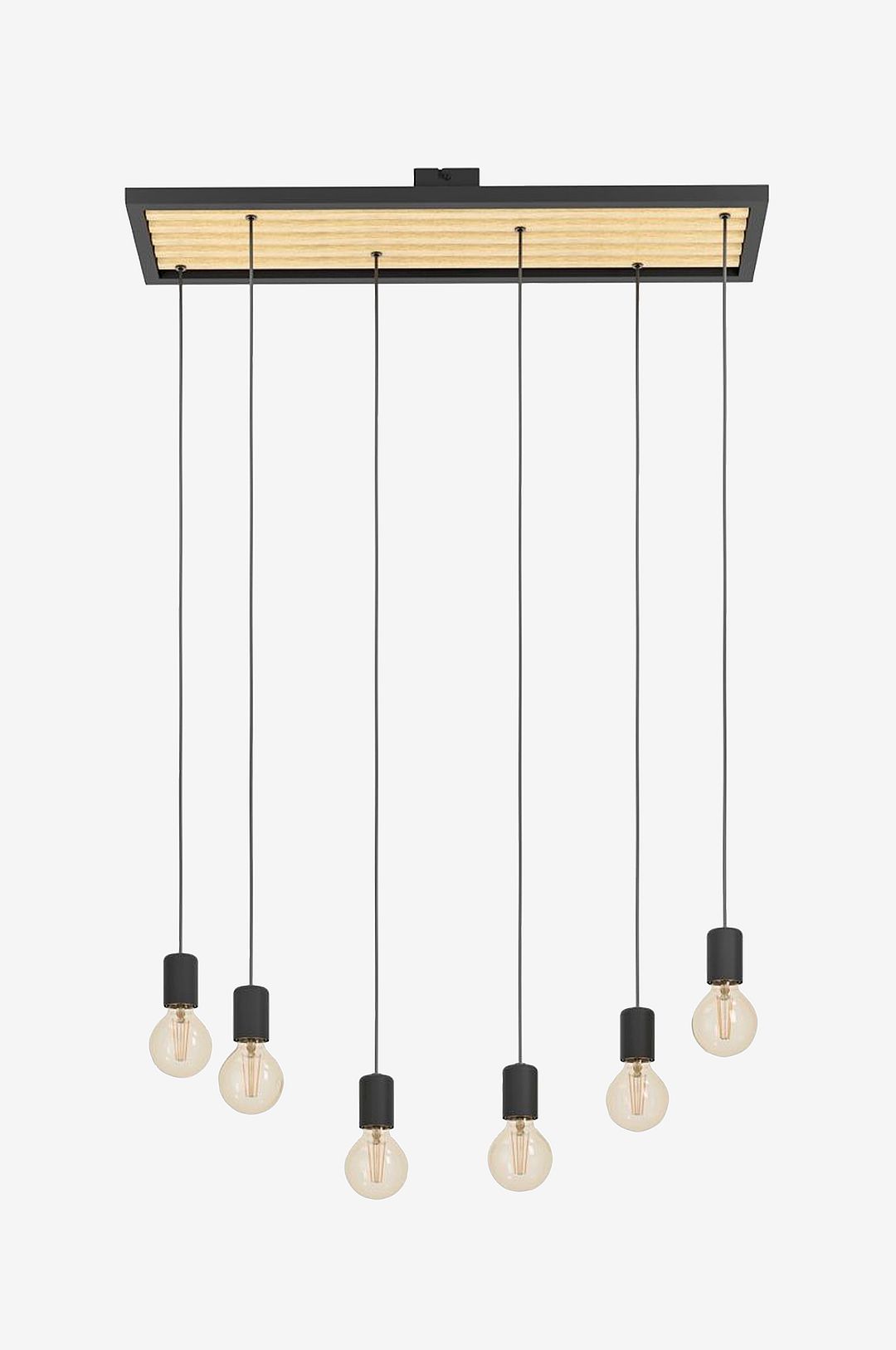 Pendellampan consett har en rektangulär ram i svart metall med bjälkar av gummiträ som är placerade i längdriktningen. Taklampan har sex lamphållare i svart metall som hänger på olika höjder. De enskilda lamphållarna har justerbara höjder. Pendellampan har en minimalistisk design som inspirerats av naturen och passar in i alla hem och är perfekt att kombinera med olika glödlampor. Med en längd på 78 cm kommer produkten att skapa ett iögonfallande inslag ovanför bordet i matsalen. De avbildade glödlamporna ingår inte. Produkten har e27-lamphållare och kräver 6 x e27-glödlampor.
