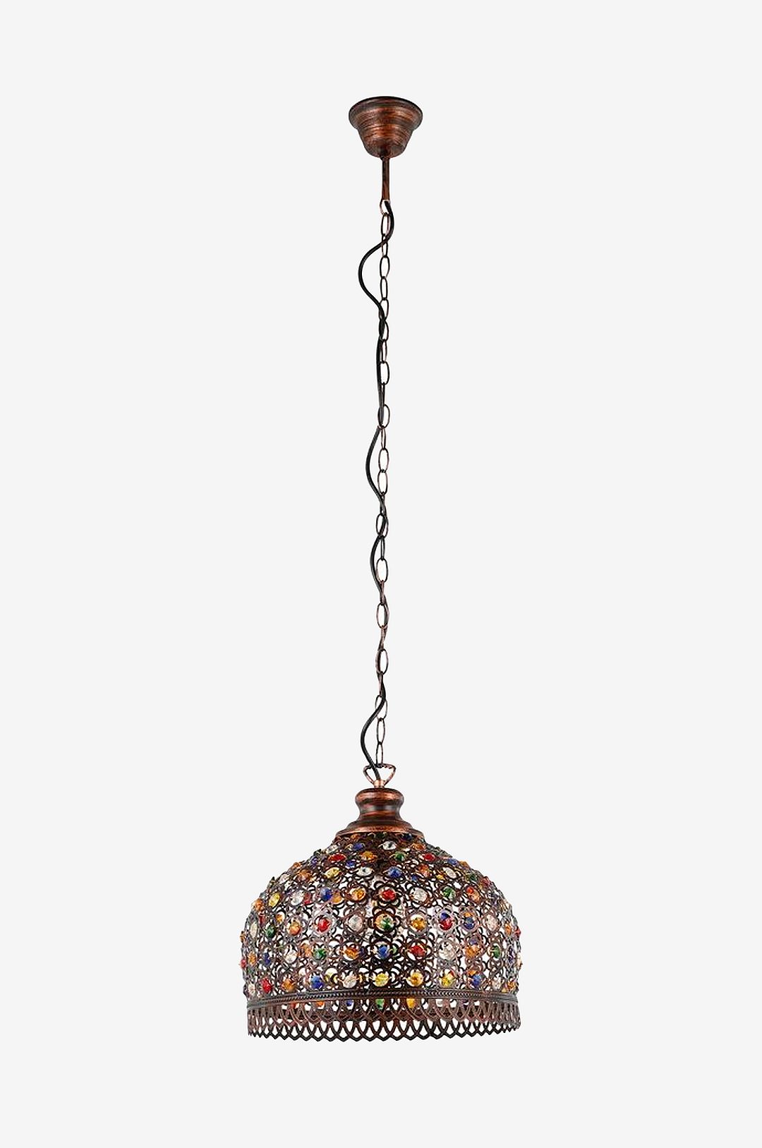 Pendellampan jadida har en rund lampskärm av metall i antik kopparfinish med böjda utskärningar i etnisk design. Lampskärmen har färgglada glasstenar och en kedja som kompletterar den etniska stilen. Detaljerna på lampskärmen skapar ett fascinerande ljus- och färgspel när pendeln är tänd. Pendellampan smälter sömlöst in i vintage-, orient- och bohotrenderna. Produkten skapar en effektfull belysning, oavsett om den placeras i vardagsrummet eller ovanför matsalsbordet. Den avbildade glödlampan ingår inte. Produkten har en e27-lamphållare och kräver en e27-glödlampa.