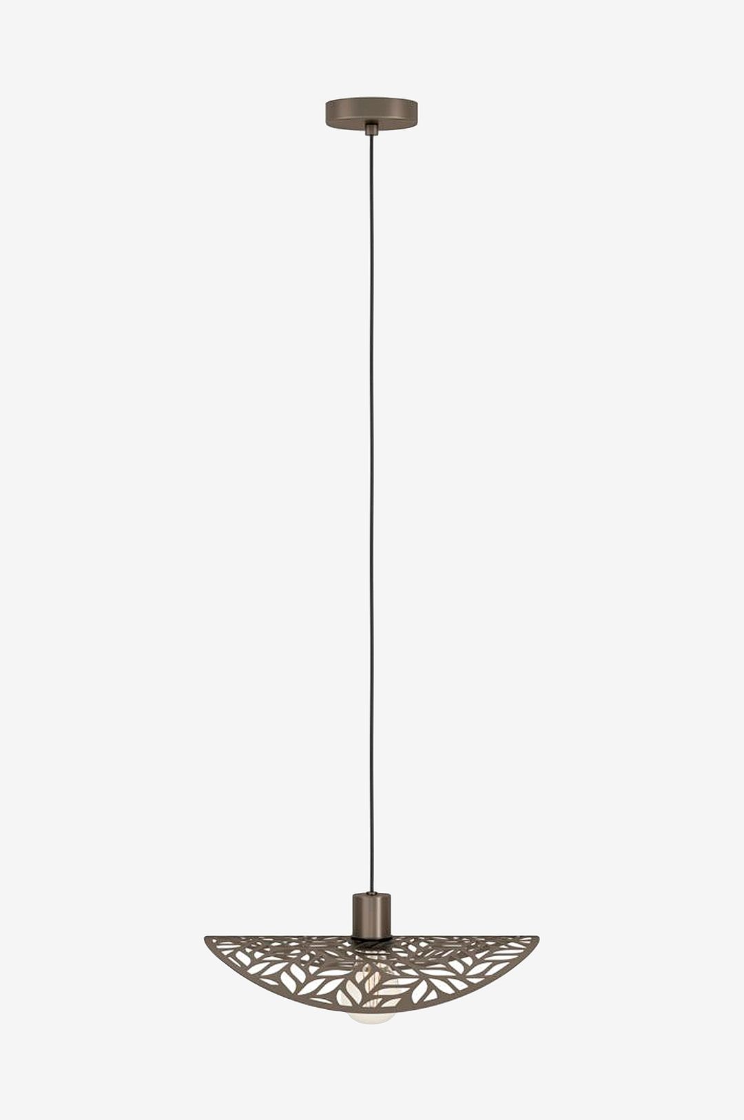 Denna swaby hängande lampa i mörkbrunt ger äkta karaktär till ditt hem med sitt rustika utseende. Bladformerna som skurits ut från stålramen skapar ett vackert skuggspel. Lampskärmen är 40 cm i diameter och den totala längden är 110 cm. Denna lampa fungerar med en e27-lampa, som finns tillgänglig separat.