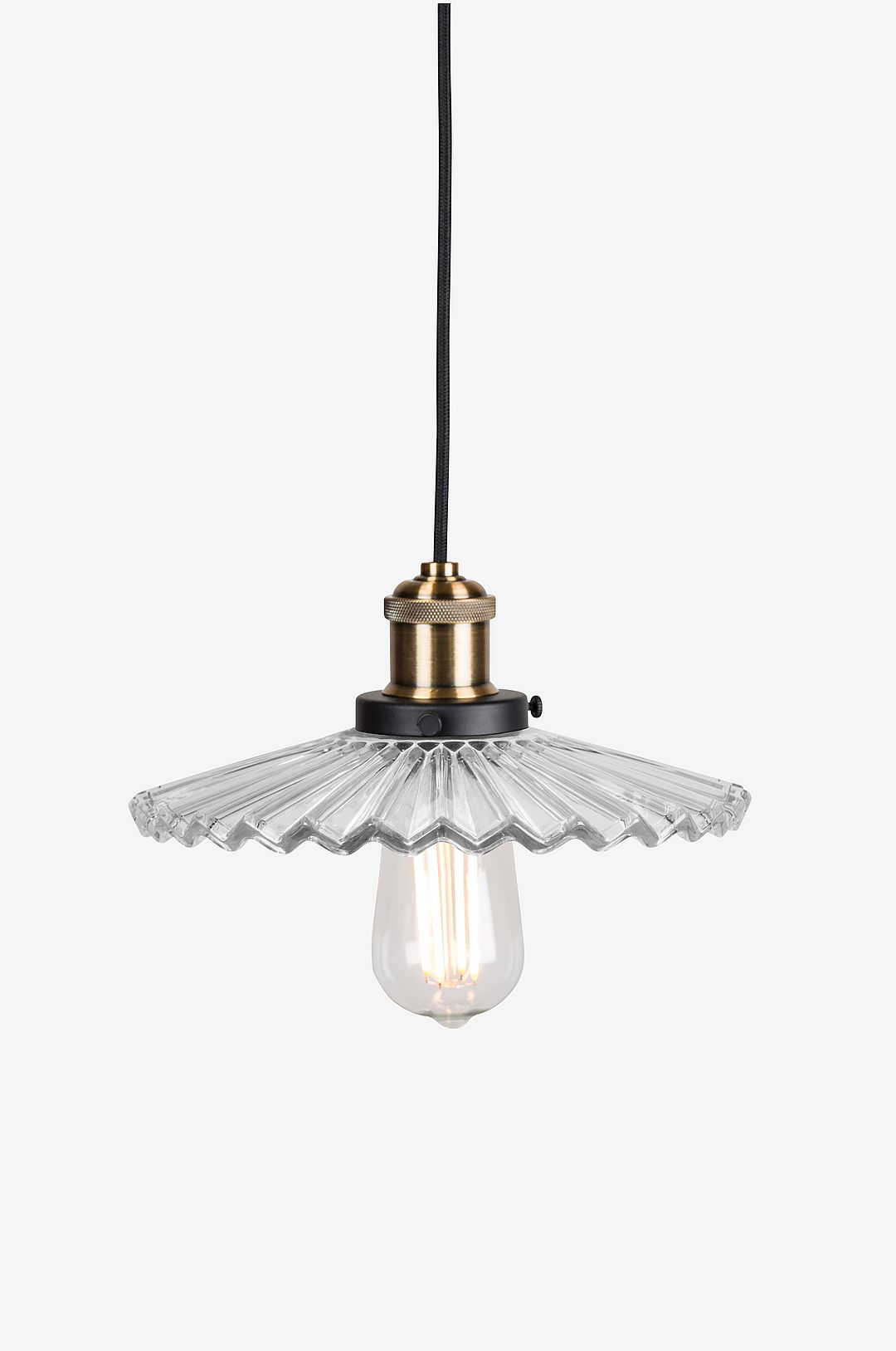 Sekelskiftsinspirerad pendel i skomakarstil med glas och detaljer i mattsvart/antikmässing. 120 cm lång svart textilkabel. Höjd 13 cm Diameter 25 cm. Lamphållare E27 Max 60W. Takkontakt ingår ej på grund av nytt EU-direktiv. De finns att beställa separat.