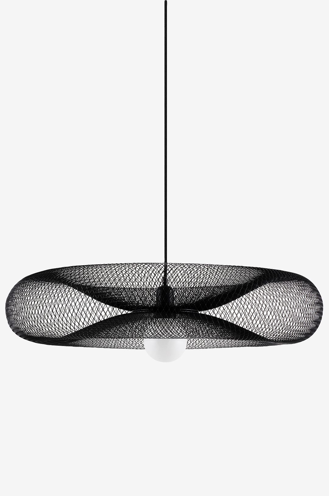 Torus är en luftig och mjuk pendel tillverkad av galvaniserat metallnät. Ljuset reflekteras fint i den blanka ytan, välj själv vilket uttryck lampan ska ha beroende på vilken ljuskälla du använder. Lampan har en 120 cm lång textilkabel samt matchande takkopp gjord av metall, kronkoppling för takanslutning medföljer ej.