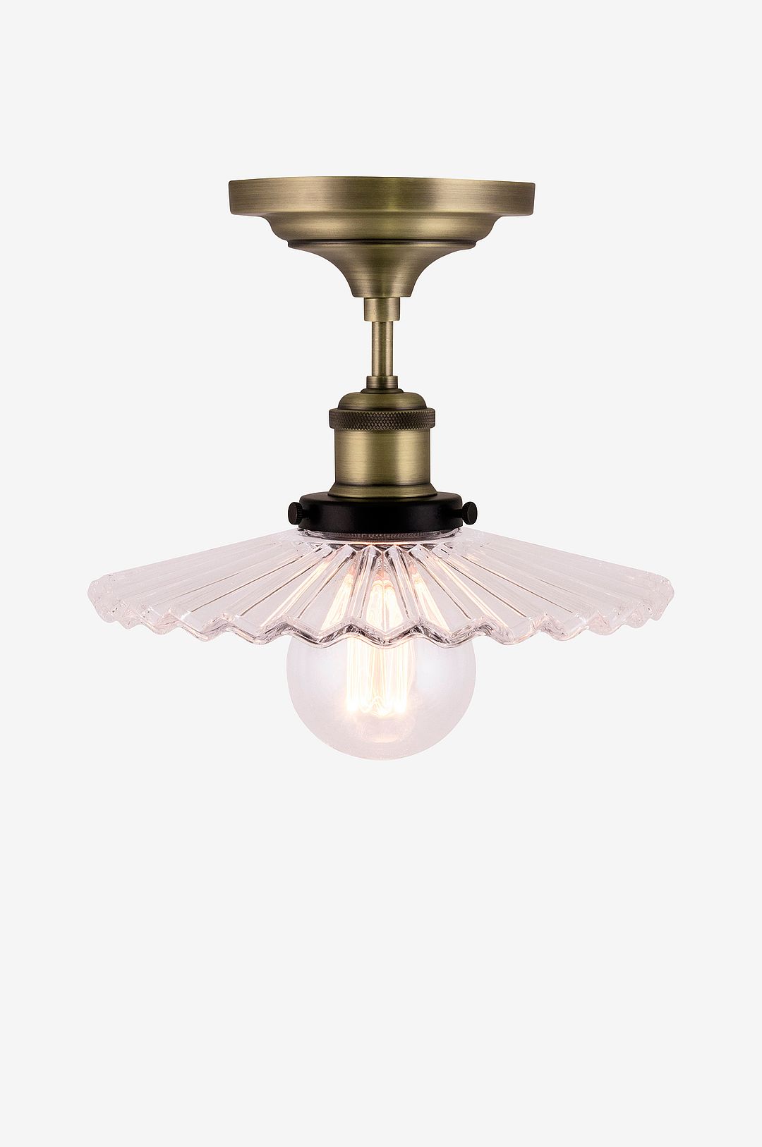 Sekelskiftsinspirerad liten plafond i skomakarstil med veckat glas och metalldetaljer i mattsvart och antikmässing. Design, GL Design Studio. Bredd 25 cm, djup 25 cm och höjd 19 cm. Lamphållare 1xE27. Max 60W. Ljuskälla ingår ej. Ojordad.