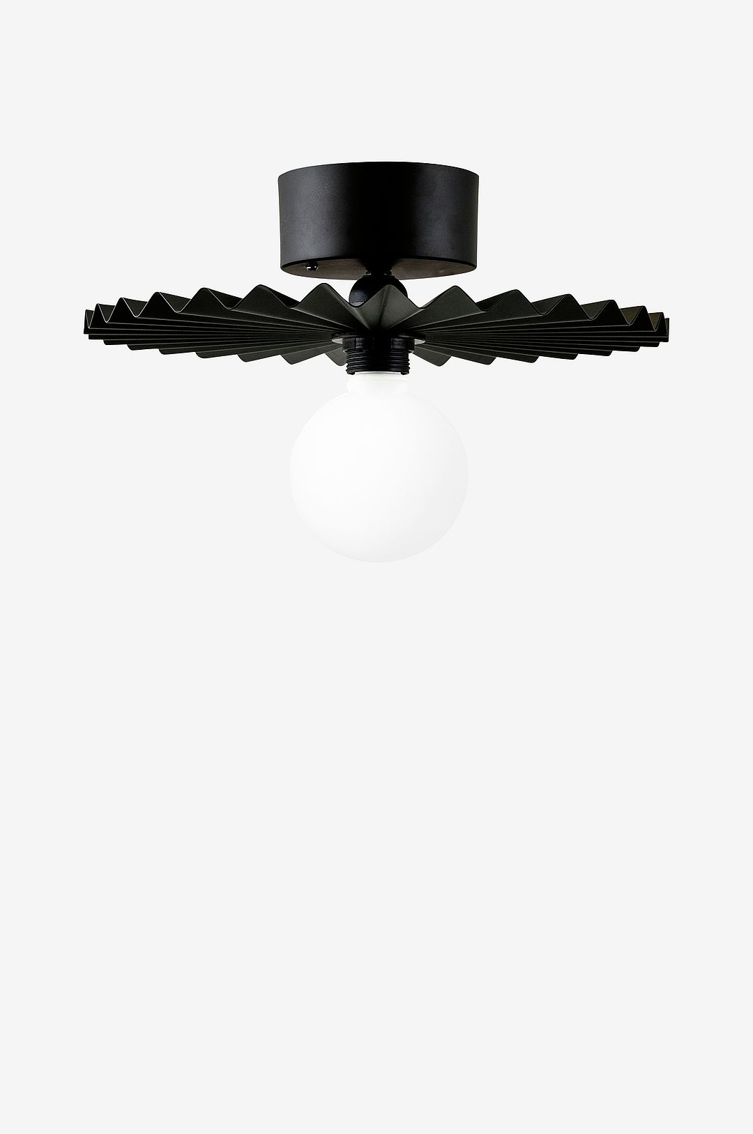 Omega plafond med sin veckade skärm i lackad metall tar för sig och blir en vacker detalj i taket eller på väggen. Anslutning för vägg är inkluderad, kronkoppling för tak säljes separat. Design, GL Design Studio. Diameter 35 cm och höjd 15 cm. Lamphållare: 1xE27. Max 60W. Ljuskälla medföljer ej. Ojordad. Bygelupphängning.