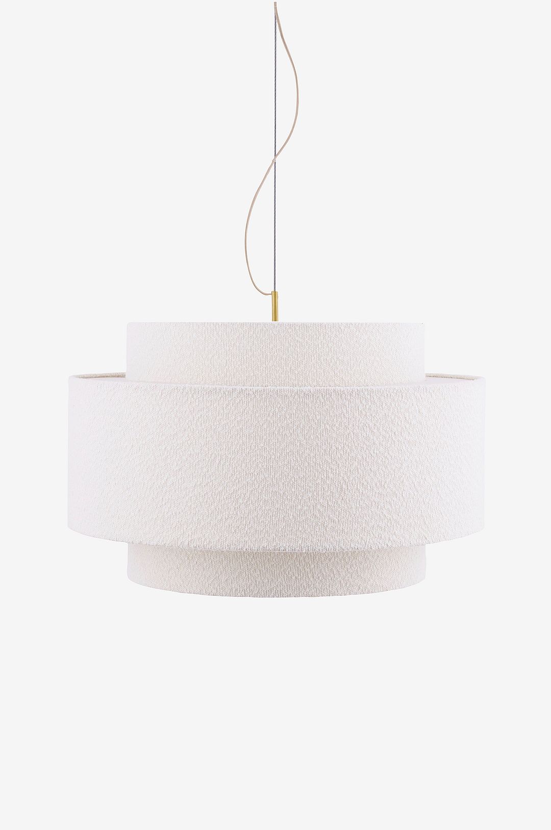 Noah är en handgjord lampa klädd i texturerat bouclé-tyg som avger ett livfullt ljus. Omsorgsfullt utvalda detaljer i äkta mässing förstärker lampans sofistikerade och exklusiva karaktär. Lampan har bländskydd både upptill och nedtill på skärmen, vilket gör att ljuset sprids mjukt och behagligt i hela rummet. Lampan levereras med en 200 cm lång beigefärgad textilkabel med vajer och en takkopp i massiv mässing. Observera att lampans plugg för takanslutning säljs separat. Noah har tre socklar för e27-lampor, vilket gör det enkelt att justera ljuset för att skapa den perfekta ljusatmosfären i ditt hem.