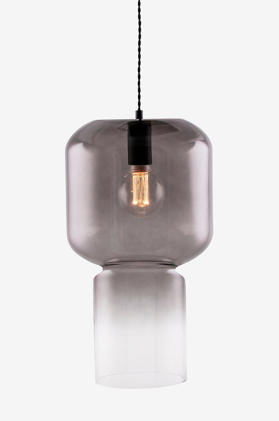 Nog taklampa har ett stilrent formspråk. Glaskupan är gjuten i ett styckes. Nog har en 120 cm lång svart tvistad textilkabel samt takkopp i svart plast. Design, Mimmi T. Silesius. Bredd 24,5 cm, djup 24,5 cm och höjd 45 cm. Lamphållare 1xE27. Max 60W. Ljuskälla ingår ej. Ojordad.
